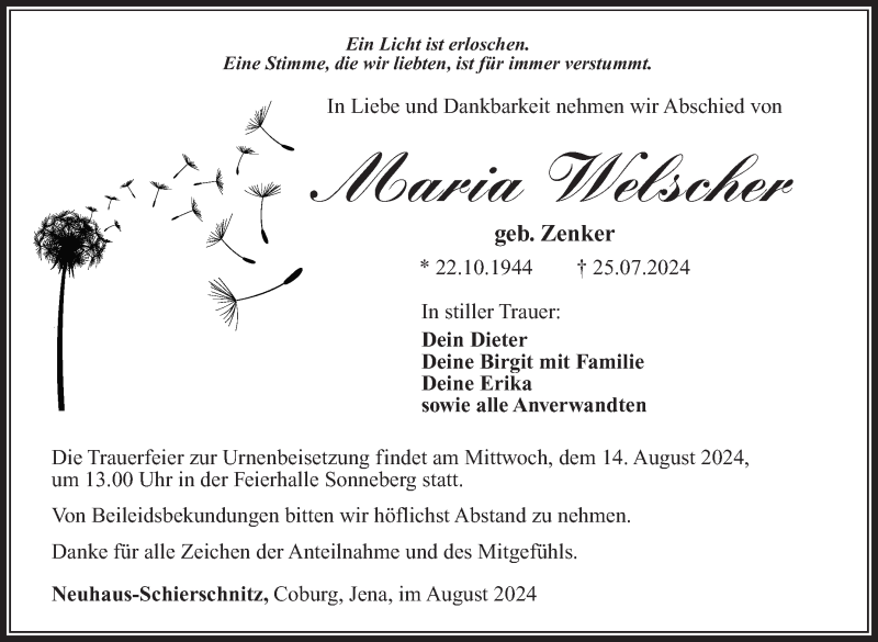 Hier finden Sie alle Traueranzeigen aus der Zeitung, die bisher für Maria Welscher erschienen sind. Weitere Traueranzeigen, die in der Zeitung erscheinen, werden hier ebenfalls aufgelistet