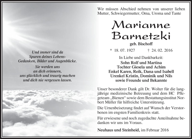 Hier finden Sie alle Traueranzeigen aus der Zeitung, die bisher für Marianne Barnetzki erschienen sind. Weitere Traueranzeigen, die in der Zeitung erscheinen, werden hier ebenfalls aufgelistet
