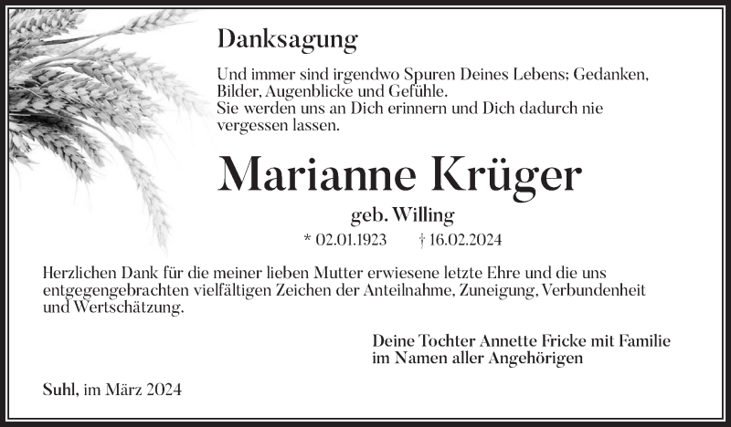 Hier finden Sie alle Traueranzeigen aus der Zeitung, die bisher für Marianne Krüger erschienen sind. Weitere Traueranzeigen, die in der Zeitung erscheinen, werden hier ebenfalls aufgelistet