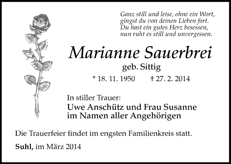 Hier finden Sie alle Traueranzeigen aus der Zeitung, die bisher für Marianne Sauerbrei erschienen sind. Weitere Traueranzeigen, die in der Zeitung erscheinen, werden hier ebenfalls aufgelistet