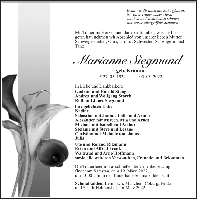 Hier finden Sie alle Traueranzeigen aus der Zeitung, die bisher für Marianne Siegmund erschienen sind. Weitere Traueranzeigen, die in der Zeitung erscheinen, werden hier ebenfalls aufgelistet
