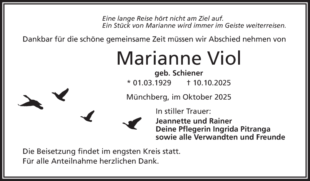 Hier finden Sie alle Traueranzeigen aus der Zeitung, die bisher für Marianne Viol erschienen sind. Weitere Traueranzeigen, die in der Zeitung erscheinen, werden hier ebenfalls aufgelistet