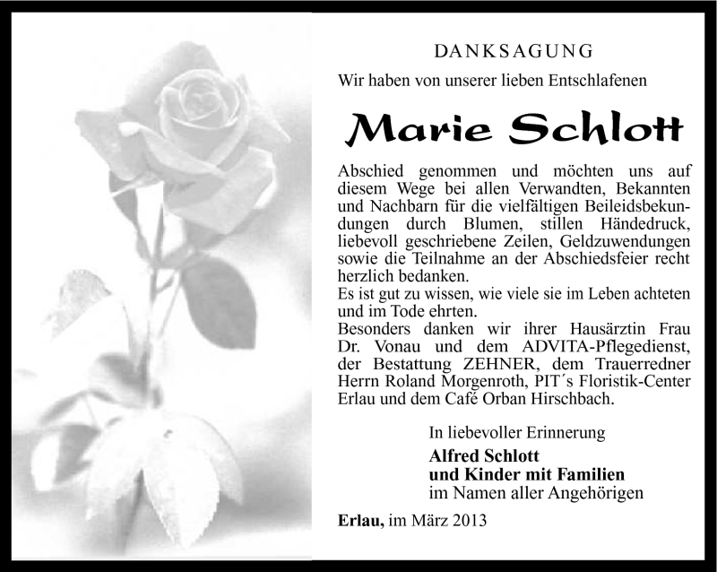 Hier finden Sie alle Traueranzeigen aus der Zeitung, die bisher für Marie Schlott erschienen sind. Weitere Traueranzeigen, die in der Zeitung erscheinen, werden hier ebenfalls aufgelistet