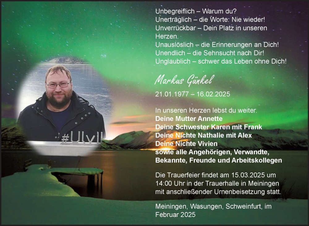 Hier finden Sie alle Traueranzeigen aus der Zeitung, die bisher für Markus Günkel erschienen sind. Weitere Traueranzeigen, die in der Zeitung erscheinen, werden hier ebenfalls aufgelistet