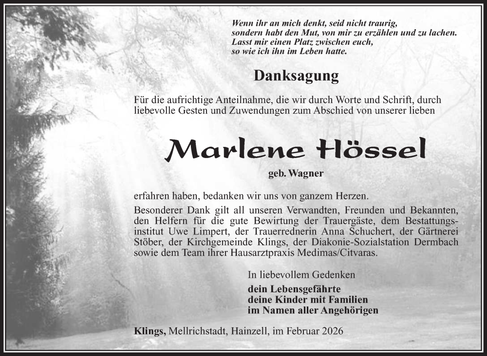 Hier finden Sie alle Traueranzeigen aus der Zeitung, die bisher für Marlene Hössel erschienen sind. Weitere Traueranzeigen, die in der Zeitung erscheinen, werden hier ebenfalls aufgelistet