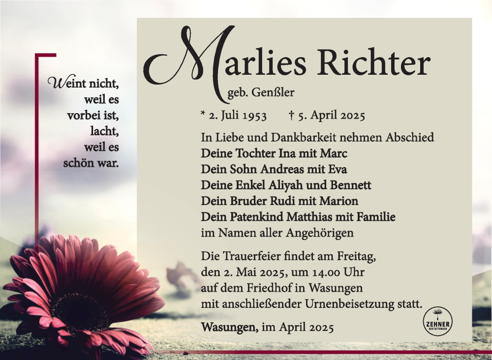 Hier finden Sie alle Traueranzeigen aus der Zeitung, die bisher für Marlies Richter erschienen sind. Weitere Traueranzeigen, die in der Zeitung erscheinen, werden hier ebenfalls aufgelistet