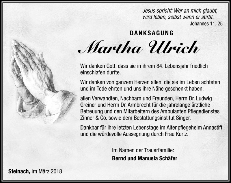 Hier finden Sie alle Traueranzeigen aus der Zeitung, die bisher für Martha Ulrich erschienen sind. Weitere Traueranzeigen, die in der Zeitung erscheinen, werden hier ebenfalls aufgelistet
