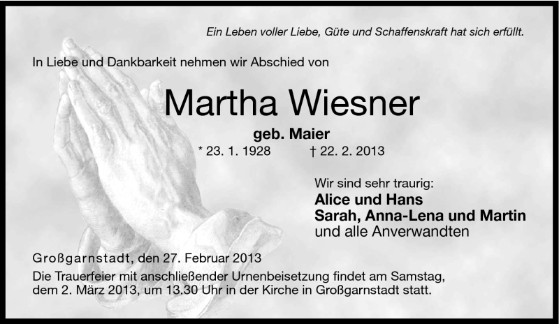 Hier finden Sie alle Traueranzeigen aus der Zeitung, die bisher für Martha Wiesner erschienen sind. Weitere Traueranzeigen, die in der Zeitung erscheinen, werden hier ebenfalls aufgelistet