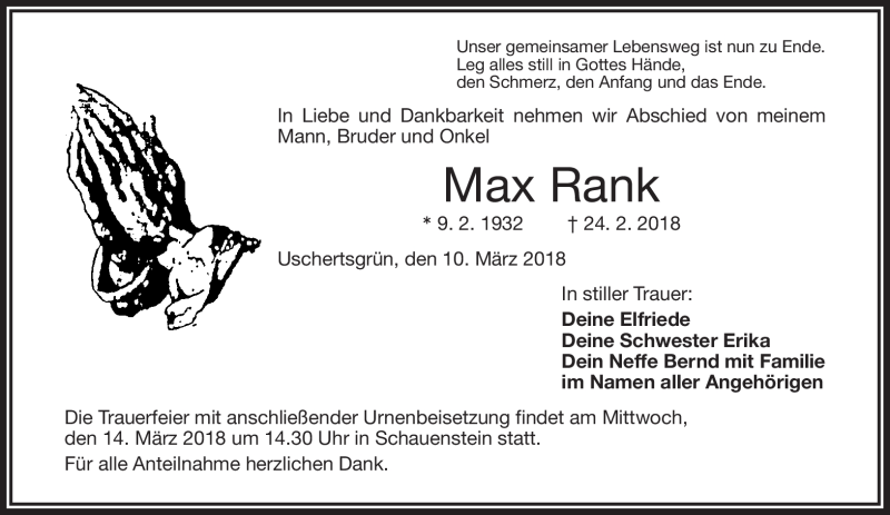 Hier finden Sie alle Traueranzeigen aus der Zeitung, die bisher für Max Rank erschienen sind. Weitere Traueranzeigen, die in der Zeitung erscheinen, werden hier ebenfalls aufgelistet