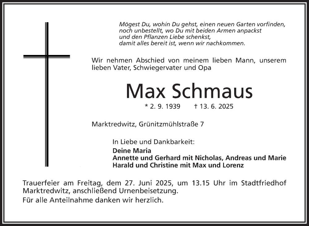 Hier finden Sie alle Traueranzeigen aus der Zeitung, die bisher für Max Schmaus erschienen sind. Weitere Traueranzeigen, die in der Zeitung erscheinen, werden hier ebenfalls aufgelistet