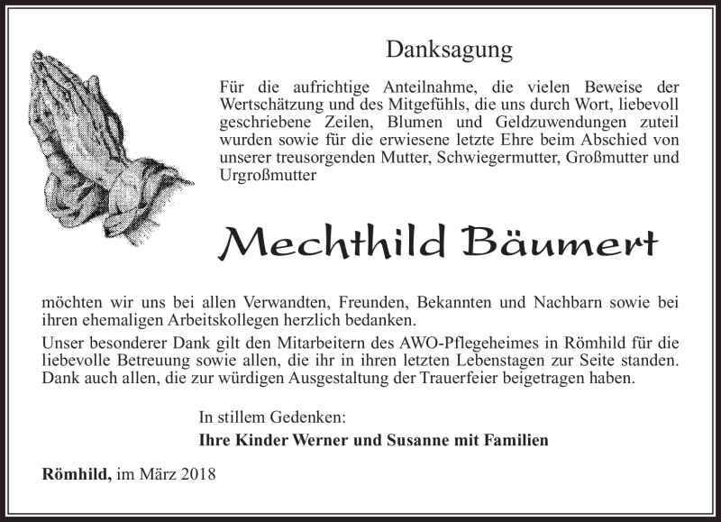 Hier finden Sie alle Traueranzeigen aus der Zeitung, die bisher für Mechthild Bäumert erschienen sind. Weitere Traueranzeigen, die in der Zeitung erscheinen, werden hier ebenfalls aufgelistet