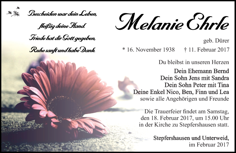 Hier finden Sie alle Traueranzeigen aus der Zeitung, die bisher für Melanie Ehrle erschienen sind. Weitere Traueranzeigen, die in der Zeitung erscheinen, werden hier ebenfalls aufgelistet