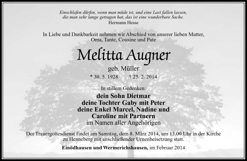 Hier finden Sie alle Traueranzeigen aus der Zeitung, die bisher für Melitta Augner erschienen sind. Weitere Traueranzeigen, die in der Zeitung erscheinen, werden hier ebenfalls aufgelistet