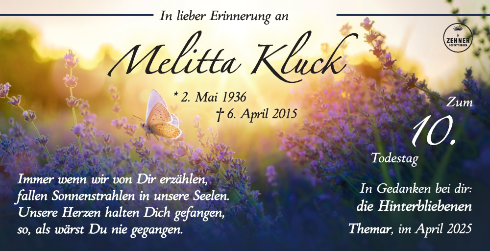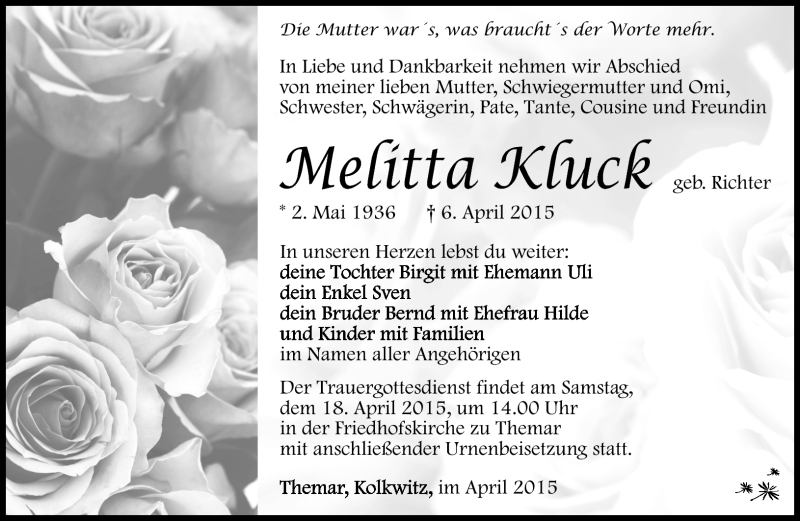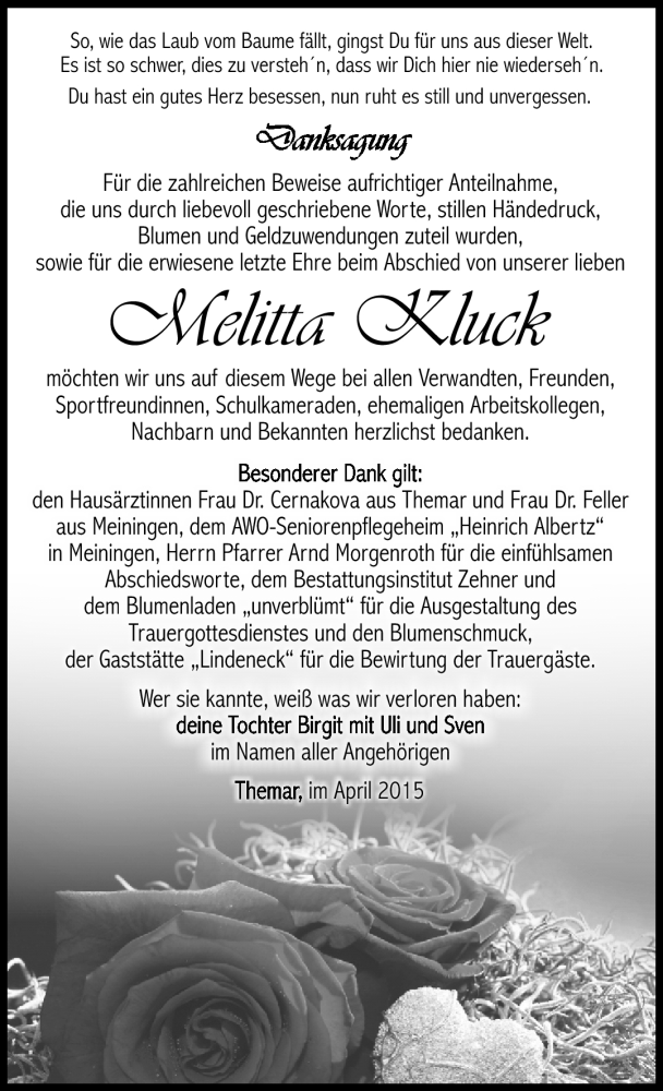 Hier finden Sie alle Traueranzeigen aus der Zeitung, die bisher für Melitta Kluck erschienen sind. Weitere Traueranzeigen, die in der Zeitung erscheinen, werden hier ebenfalls aufgelistet