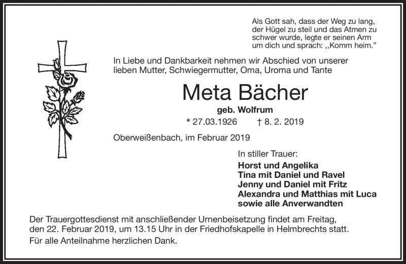 Hier finden Sie alle Traueranzeigen aus der Zeitung, die bisher für Meta Bächer erschienen sind. Weitere Traueranzeigen, die in der Zeitung erscheinen, werden hier ebenfalls aufgelistet