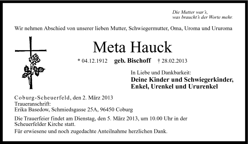 Hier finden Sie alle Traueranzeigen aus der Zeitung, die bisher für Meta Hauck erschienen sind. Weitere Traueranzeigen, die in der Zeitung erscheinen, werden hier ebenfalls aufgelistet