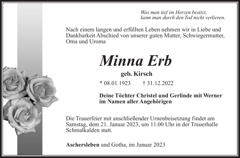 Hier finden Sie alle Traueranzeigen aus der Zeitung, die bisher für Minna Erb erschienen sind. Weitere Traueranzeigen, die in der Zeitung erscheinen, werden hier ebenfalls aufgelistet