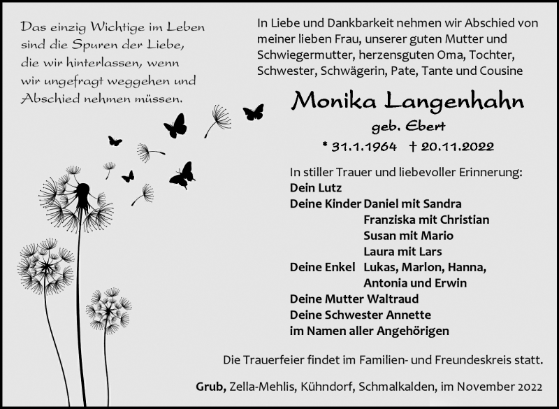 Hier finden Sie alle Traueranzeigen aus der Zeitung, die bisher für Monika Langhahn erschienen sind. Weitere Traueranzeigen, die in der Zeitung erscheinen, werden hier ebenfalls aufgelistet
