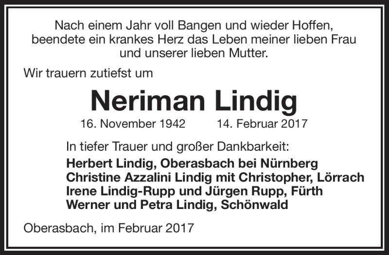 Hier finden Sie alle Traueranzeigen aus der Zeitung, die bisher für Neriman Lindig erschienen sind. Weitere Traueranzeigen, die in der Zeitung erscheinen, werden hier ebenfalls aufgelistet
