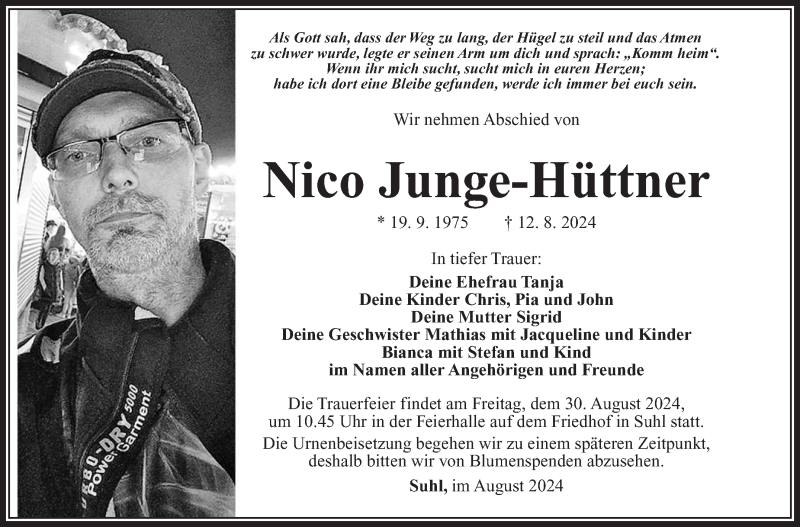 Hier finden Sie alle Traueranzeigen aus der Zeitung, die bisher für Nico Junge-Hüttner erschienen sind. Weitere Traueranzeigen, die in der Zeitung erscheinen, werden hier ebenfalls aufgelistet