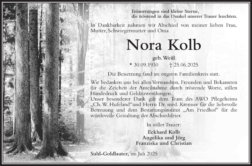 Hier finden Sie alle Traueranzeigen aus der Zeitung, die bisher für Nora Kolb erschienen sind. Weitere Traueranzeigen, die in der Zeitung erscheinen, werden hier ebenfalls aufgelistet