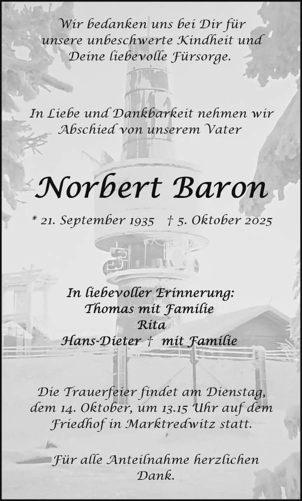 Hier finden Sie alle Traueranzeigen aus der Zeitung, die bisher für Norbert Baron erschienen sind. Weitere Traueranzeigen, die in der Zeitung erscheinen, werden hier ebenfalls aufgelistet