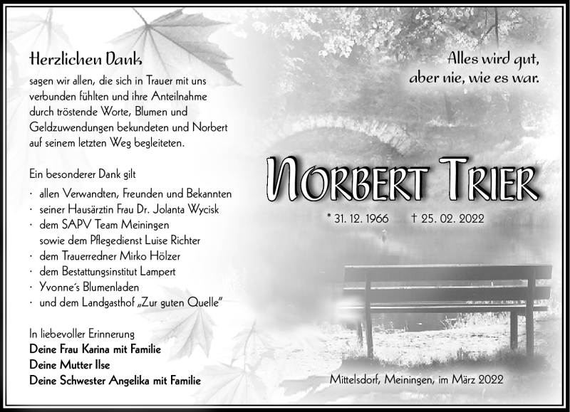 Hier finden Sie alle Traueranzeigen aus der Zeitung, die bisher für Norbert Trier erschienen sind. Weitere Traueranzeigen, die in der Zeitung erscheinen, werden hier ebenfalls aufgelistet