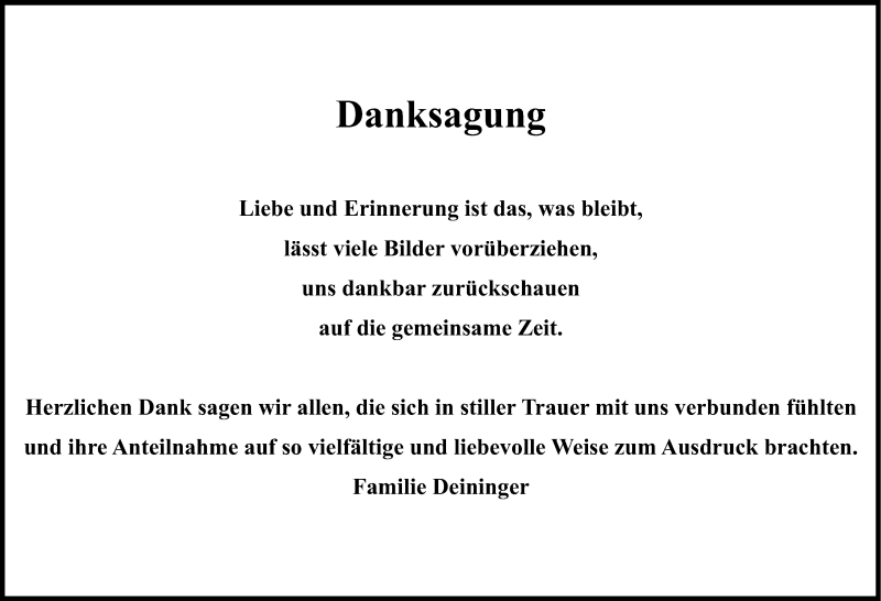 Hier finden Sie alle Traueranzeigen aus der Zeitung, die bisher für Oskar Deininger erschienen sind. Weitere Traueranzeigen, die in der Zeitung erscheinen, werden hier ebenfalls aufgelistet