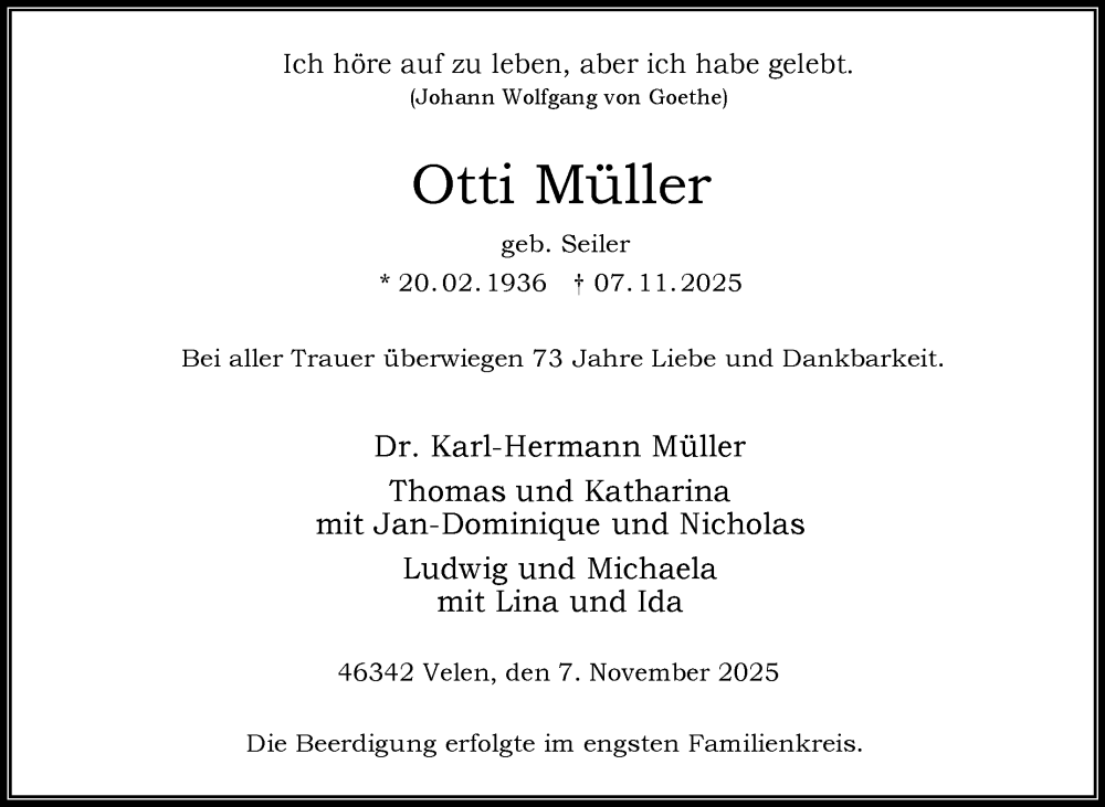 Hier finden Sie alle Traueranzeigen aus der Zeitung, die bisher für Otti Müller erschienen sind. Weitere Traueranzeigen, die in der Zeitung erscheinen, werden hier ebenfalls aufgelistet