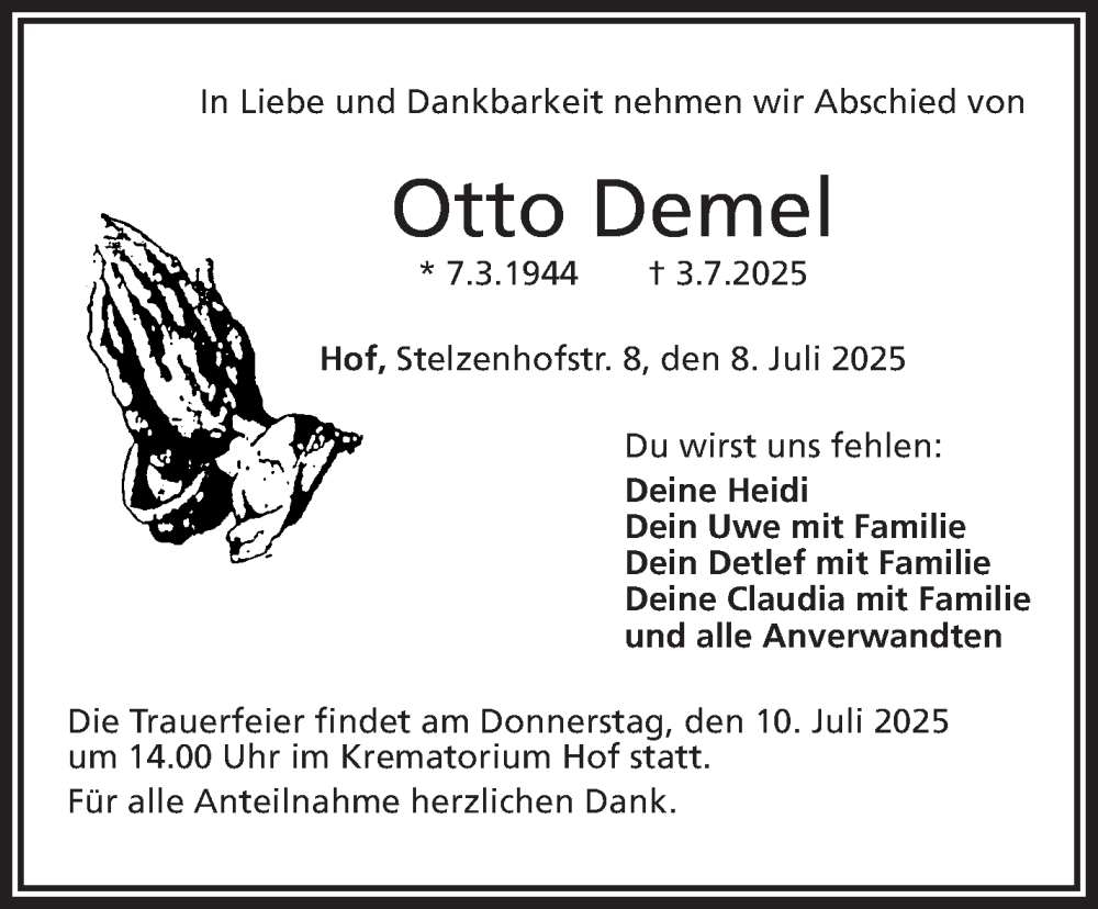 Hier finden Sie alle Traueranzeigen aus der Zeitung, die bisher für Otto Demel erschienen sind. Weitere Traueranzeigen, die in der Zeitung erscheinen, werden hier ebenfalls aufgelistet