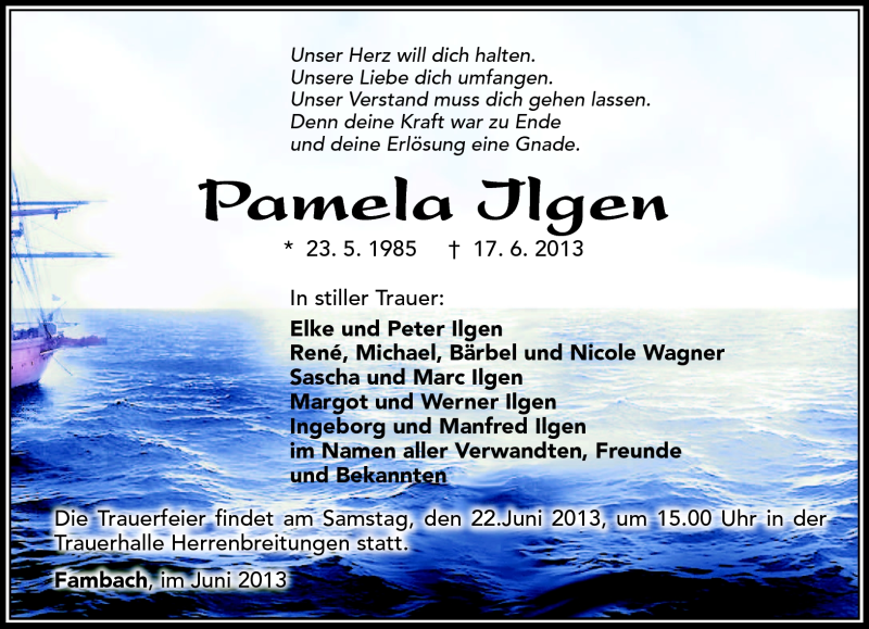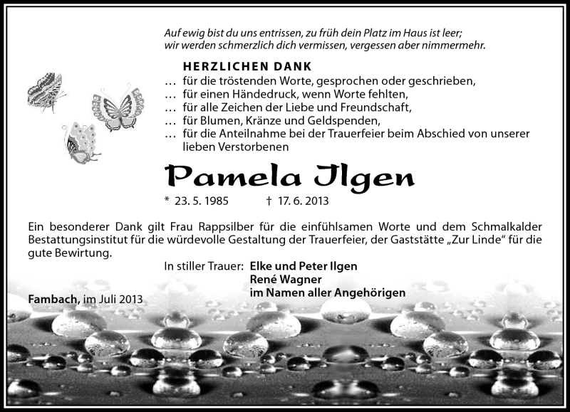 Hier finden Sie alle Traueranzeigen aus der Zeitung, die bisher für Pamela Ilgen erschienen sind. Weitere Traueranzeigen, die in der Zeitung erscheinen, werden hier ebenfalls aufgelistet