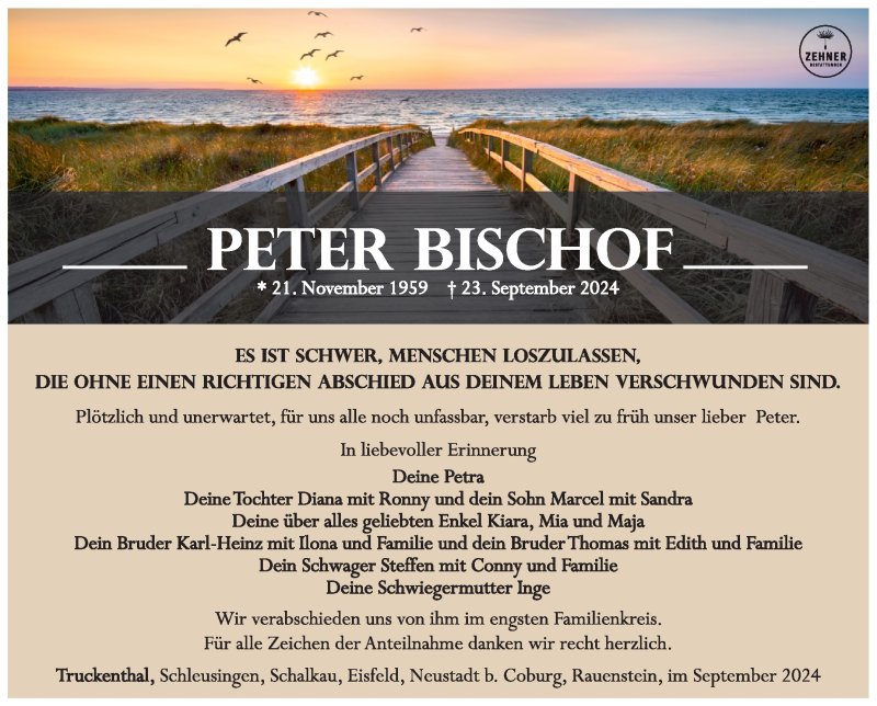 Hier finden Sie alle Traueranzeigen aus der Zeitung, die bisher für Peter Bischof erschienen sind. Weitere Traueranzeigen, die in der Zeitung erscheinen, werden hier ebenfalls aufgelistet