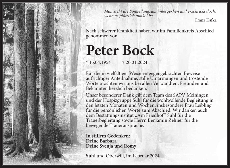 Hier finden Sie alle Traueranzeigen aus der Zeitung, die bisher für Peter Bock erschienen sind. Weitere Traueranzeigen, die in der Zeitung erscheinen, werden hier ebenfalls aufgelistet