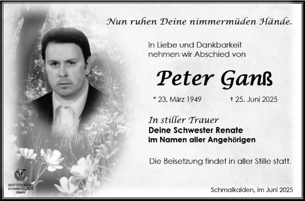 Hier finden Sie alle Traueranzeigen aus der Zeitung, die bisher für Peter Ganß erschienen sind. Weitere Traueranzeigen, die in der Zeitung erscheinen, werden hier ebenfalls aufgelistet