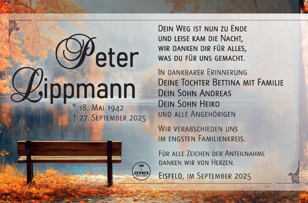 Hier finden Sie alle Traueranzeigen aus der Zeitung, die bisher für Peter Lippmann erschienen sind. Weitere Traueranzeigen, die in der Zeitung erscheinen, werden hier ebenfalls aufgelistet