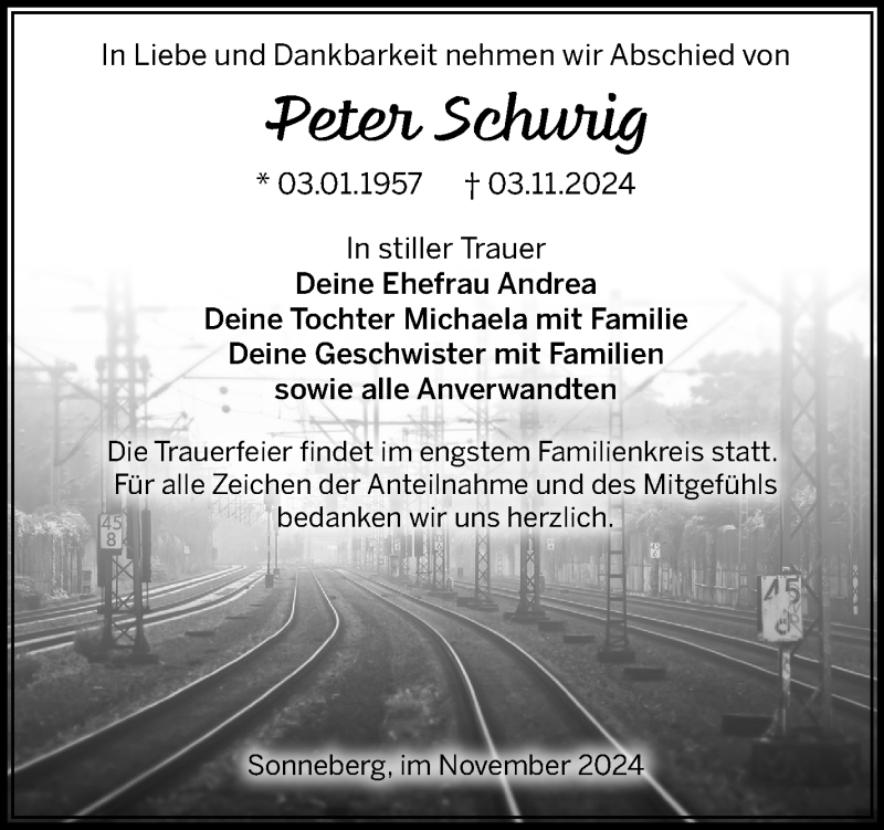 Hier finden Sie alle Traueranzeigen aus der Zeitung, die bisher für Peter Schurig erschienen sind. Weitere Traueranzeigen, die in der Zeitung erscheinen, werden hier ebenfalls aufgelistet