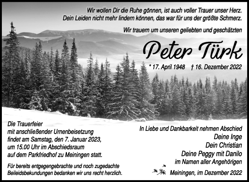 Hier finden Sie alle Traueranzeigen aus der Zeitung, die bisher für Peter Türk erschienen sind. Weitere Traueranzeigen, die in der Zeitung erscheinen, werden hier ebenfalls aufgelistet