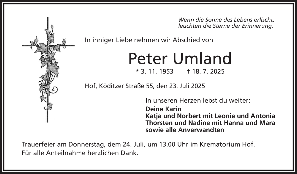 Hier finden Sie alle Traueranzeigen aus der Zeitung, die bisher für Peter Umland erschienen sind. Weitere Traueranzeigen, die in der Zeitung erscheinen, werden hier ebenfalls aufgelistet