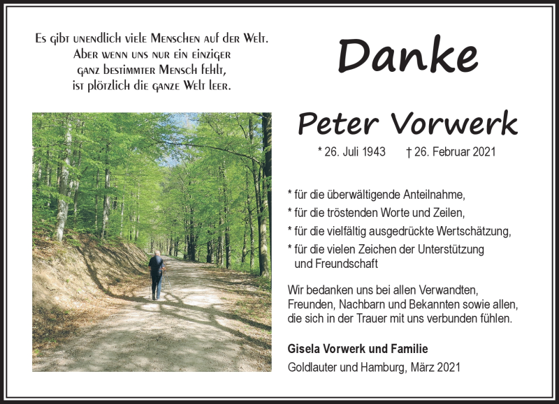 Hier finden Sie alle Traueranzeigen aus der Zeitung, die bisher für Peter Vorwerk erschienen sind. Weitere Traueranzeigen, die in der Zeitung erscheinen, werden hier ebenfalls aufgelistet