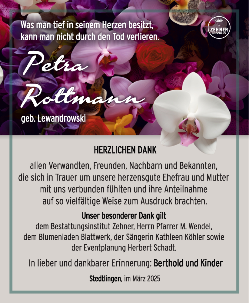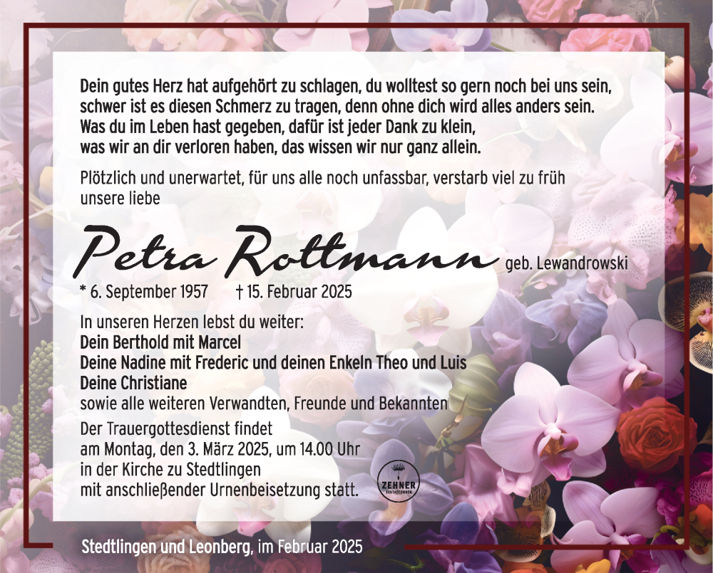 Hier finden Sie alle Traueranzeigen aus der Zeitung, die bisher für Petra Rottmann erschienen sind. Weitere Traueranzeigen, die in der Zeitung erscheinen, werden hier ebenfalls aufgelistet