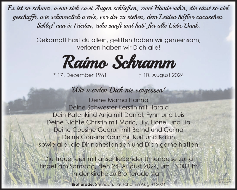Hier finden Sie alle Traueranzeigen aus der Zeitung, die bisher für Raimo Schramm erschienen sind. Weitere Traueranzeigen, die in der Zeitung erscheinen, werden hier ebenfalls aufgelistet