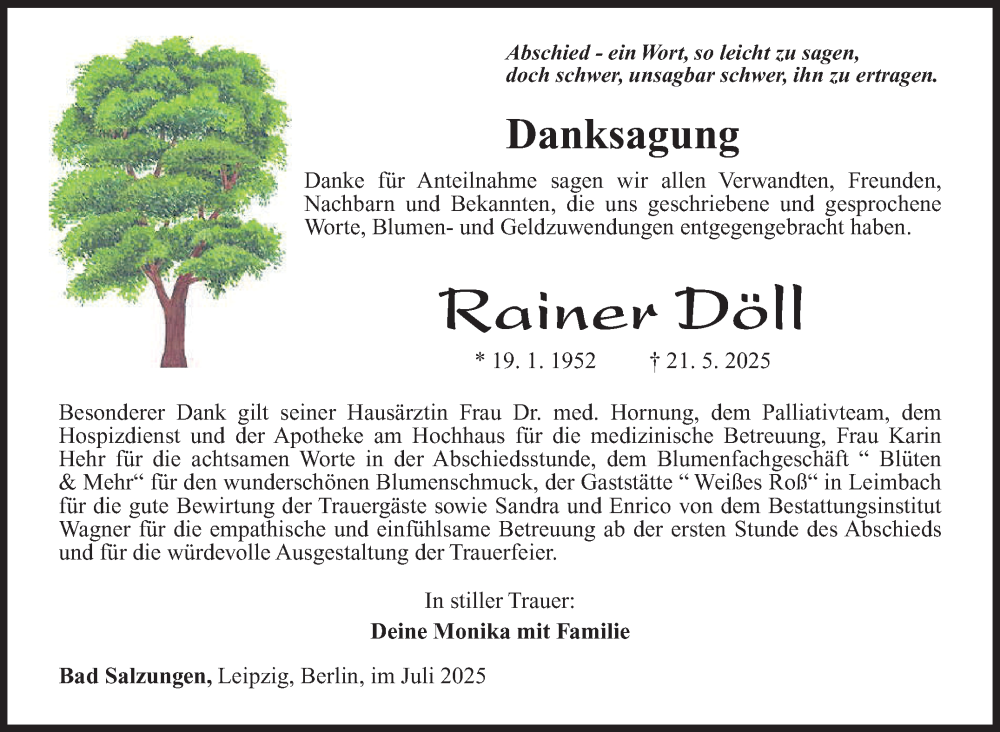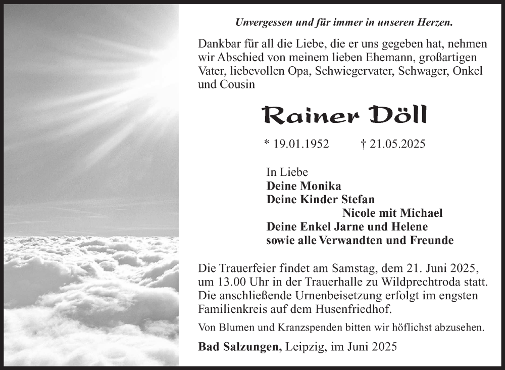 Hier finden Sie alle Traueranzeigen aus der Zeitung, die bisher für Rainer Döll erschienen sind. Weitere Traueranzeigen, die in der Zeitung erscheinen, werden hier ebenfalls aufgelistet