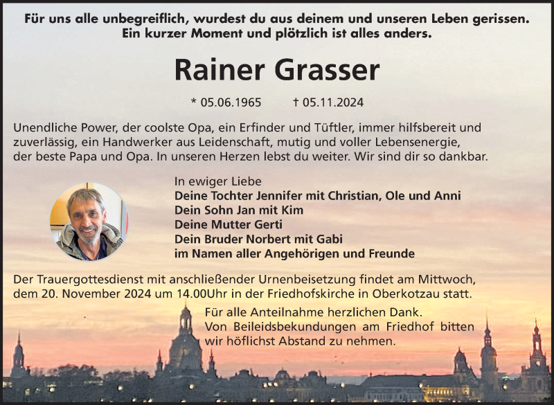 Hier finden Sie alle Traueranzeigen aus der Zeitung, die bisher für Rainer Grasser erschienen sind. Weitere Traueranzeigen, die in der Zeitung erscheinen, werden hier ebenfalls aufgelistet