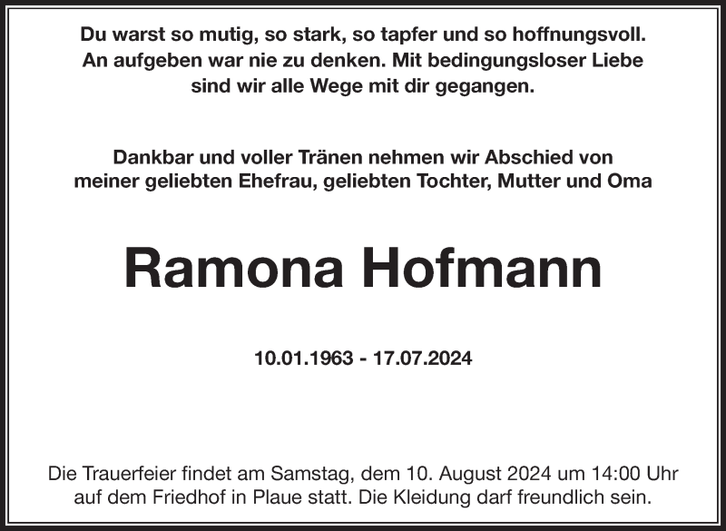 Hier finden Sie alle Traueranzeigen aus der Zeitung, die bisher für Ramona Hofmann erschienen sind. Weitere Traueranzeigen, die in der Zeitung erscheinen, werden hier ebenfalls aufgelistet