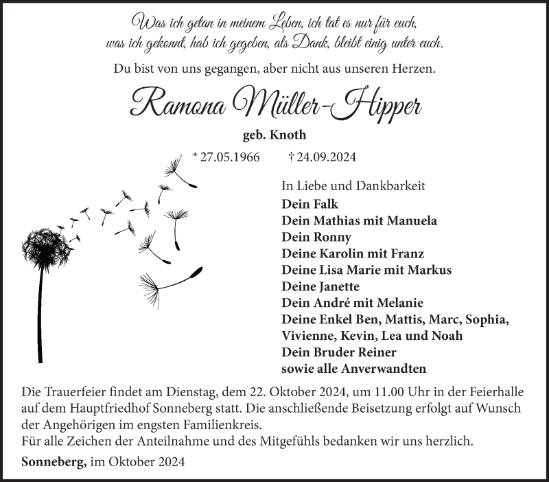 Hier finden Sie alle Traueranzeigen aus der Zeitung, die bisher für Ramona Müller-Hipper erschienen sind. Weitere Traueranzeigen, die in der Zeitung erscheinen, werden hier ebenfalls aufgelistet