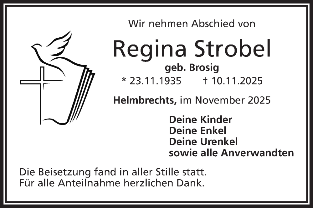 Hier finden Sie alle Traueranzeigen aus der Zeitung, die bisher für Regina Strobel erschienen sind. Weitere Traueranzeigen, die in der Zeitung erscheinen, werden hier ebenfalls aufgelistet