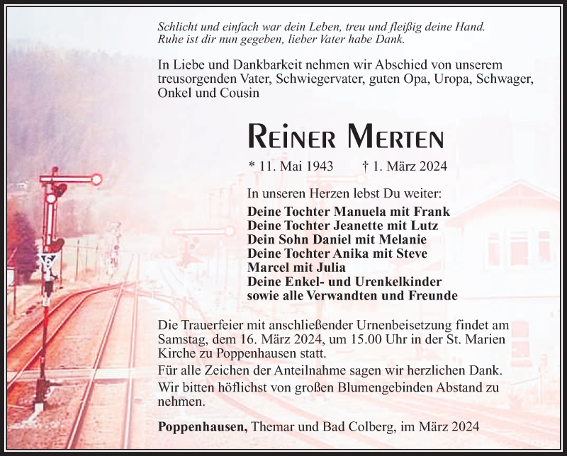 Hier finden Sie alle Traueranzeigen aus der Zeitung, die bisher für Reiner Merten erschienen sind. Weitere Traueranzeigen, die in der Zeitung erscheinen, werden hier ebenfalls aufgelistet