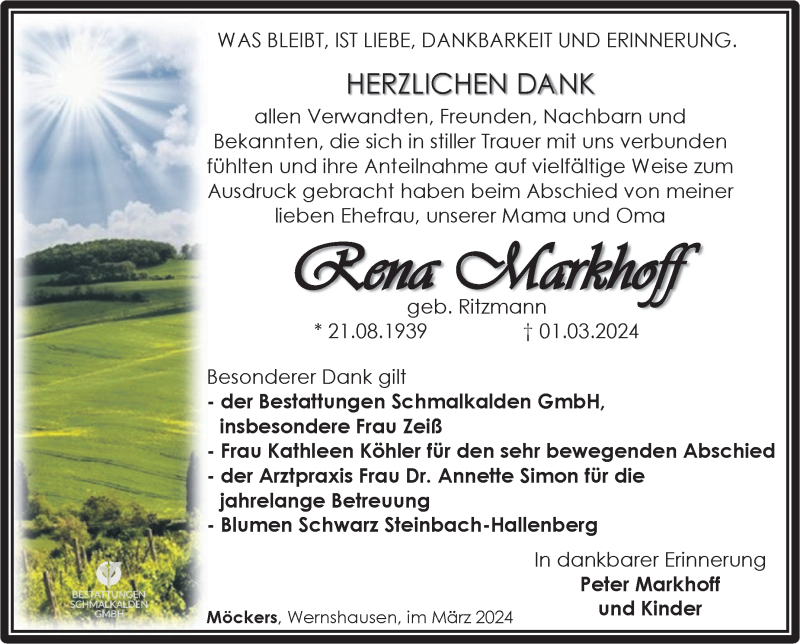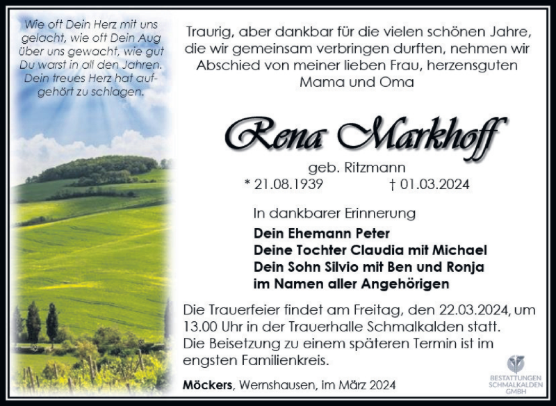 Hier finden Sie alle Traueranzeigen aus der Zeitung, die bisher für Rena Markhoff erschienen sind. Weitere Traueranzeigen, die in der Zeitung erscheinen, werden hier ebenfalls aufgelistet