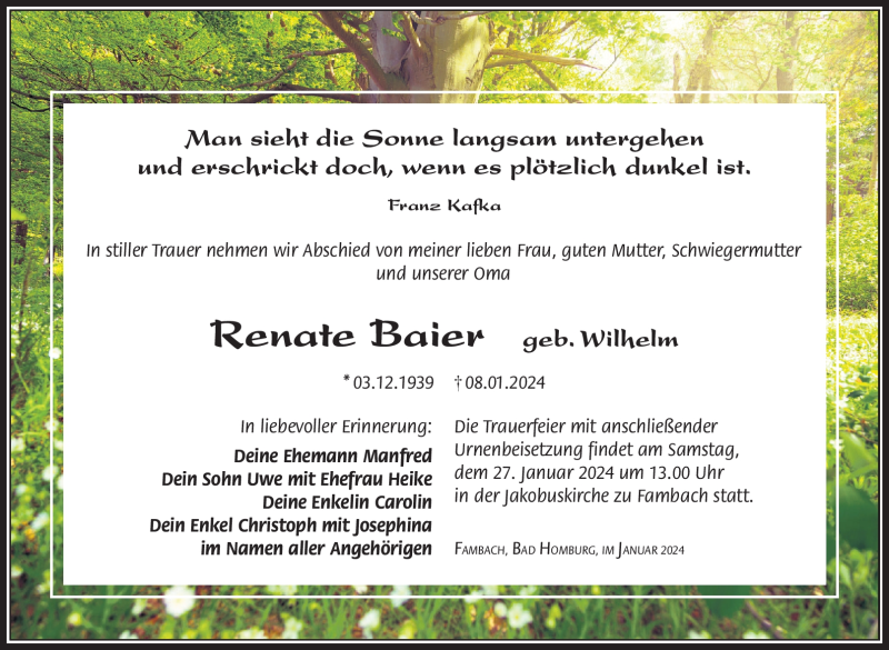 Hier finden Sie alle Traueranzeigen aus der Zeitung, die bisher für Renate Baier erschienen sind. Weitere Traueranzeigen, die in der Zeitung erscheinen, werden hier ebenfalls aufgelistet