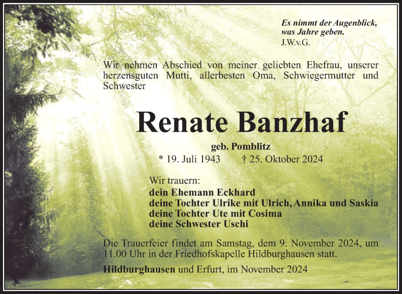 Hier finden Sie alle Traueranzeigen aus der Zeitung, die bisher für Renate Banzhaf erschienen sind. Weitere Traueranzeigen, die in der Zeitung erscheinen, werden hier ebenfalls aufgelistet